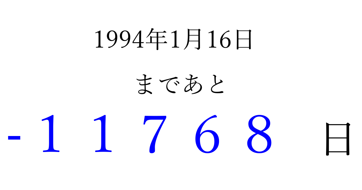 1994年1月16日(日)は もう 00000 日過ぎました 追加すると、トップページからすぐ選べるようになります ※2026/04/06現在の結果です。 最新の状態に更新する ↓シェアして、タイムライン上にカウントダウンを表示しよう!↓ 📤 この結果を共有する Tweet シェア Threads Bluesky 別の日付でカウントダウン 1994年1月のカレンダー このページをブックマークに追加すると、いつでもカウントダウンを確認できます。 (PC: Ctrl+D / Mac: ⌘+D) hitome-notes.comでは以下のページも運営しています。 指定日と期間から日付を計算 | ガチャ確率計算・シミュレーション | プライバシー・ポリシー 運営者:Avocado