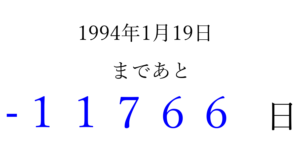 1994年1月19日(水)は もう 00000 日過ぎました 追加すると、トップページからすぐ選べるようになります ※2026/04/07現在の結果です。 最新の状態に更新する ↓シェアして、タイムライン上にカウントダウンを表示しよう!↓ 📤 この結果を共有する Tweet シェア Threads Bluesky 別の日付でカウントダウン 1994年1月のカレンダー このページをブックマークに追加すると、いつでもカウントダウンを確認できます。 (PC: Ctrl+D / Mac: ⌘+D) hitome-notes.comでは以下のページも運営しています。 指定日と期間から日付を計算 | ガチャ確率計算・シミュレーション | プライバシー・ポリシー 運営者:Avocado