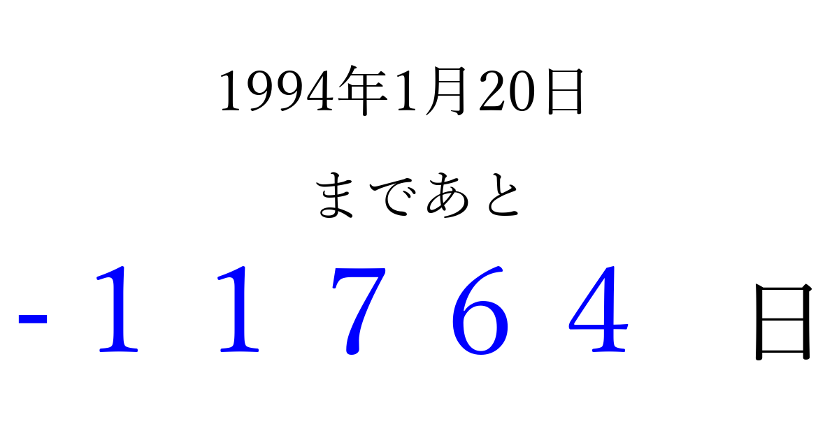 1994年1月20日(木)は もう 00000 日過ぎました 追加すると、トップページからすぐ選べるようになります ※2026/04/06現在の結果です。 最新の状態に更新する ↓シェアして、タイムライン上にカウントダウンを表示しよう!↓ 📤 この結果を共有する Tweet シェア Threads Bluesky 別の日付でカウントダウン 1994年1月のカレンダー このページをブックマークに追加すると、いつでもカウントダウンを確認できます。 (PC: Ctrl+D / Mac: ⌘+D) hitome-notes.comでは以下のページも運営しています。 指定日と期間から日付を計算 | ガチャ確率計算・シミュレーション | プライバシー・ポリシー 運営者:Avocado