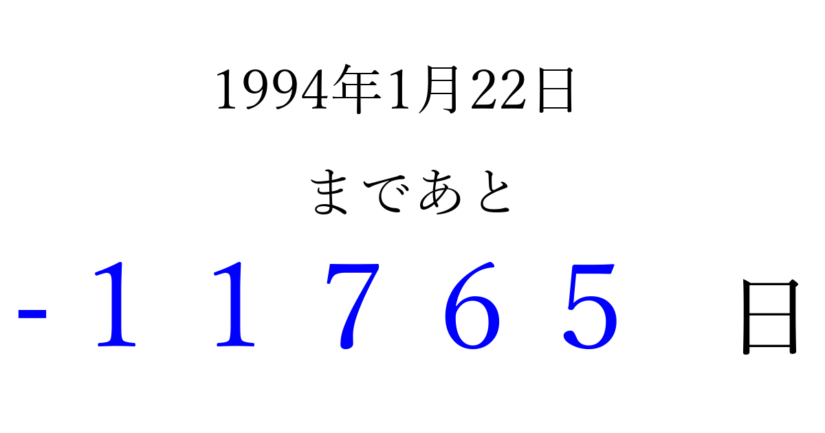 1994年1月22日(土)は もう 00000 日過ぎました 追加すると、トップページからすぐ選べるようになります ※2026/04/09現在の結果です。 最新の状態に更新する ↓シェアして、タイムライン上にカウントダウンを表示しよう!↓ 📤 この結果を共有する Tweet シェア Threads Bluesky 別の日付でカウントダウン 1994年1月のカレンダー このページをブックマークに追加すると、いつでもカウントダウンを確認できます。 (PC: Ctrl+D / Mac: ⌘+D) hitome-notes.comでは以下のページも運営しています。 指定日と期間から日付を計算 | ガチャ確率計算・シミュレーション | プライバシー・ポリシー 運営者:Avocado