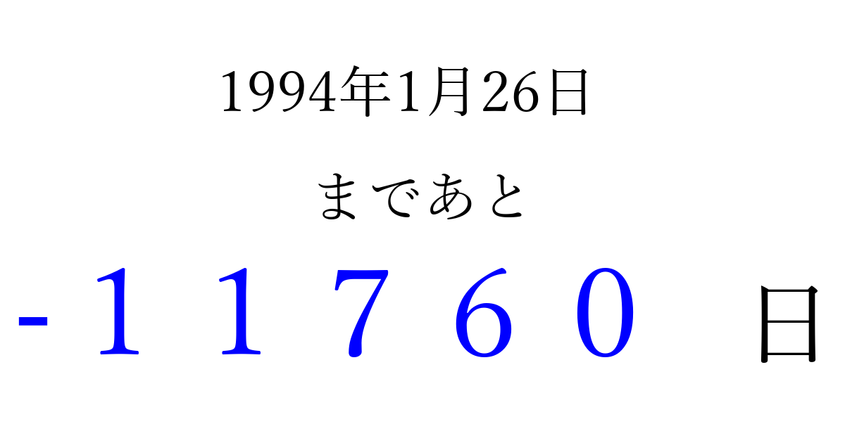 1994年1月26日(水)は もう 00000 日過ぎました 追加すると、トップページからすぐ選べるようになります ※2026/04/08現在の結果です。 最新の状態に更新する ↓シェアして、タイムライン上にカウントダウンを表示しよう!↓ 📤 この結果を共有する Tweet シェア Threads Bluesky 別の日付でカウントダウン 1994年1月のカレンダー このページをブックマークに追加すると、いつでもカウントダウンを確認できます。 (PC: Ctrl+D / Mac: ⌘+D) hitome-notes.comでは以下のページも運営しています。 指定日と期間から日付を計算 | ガチャ確率計算・シミュレーション | プライバシー・ポリシー 運営者:Avocado