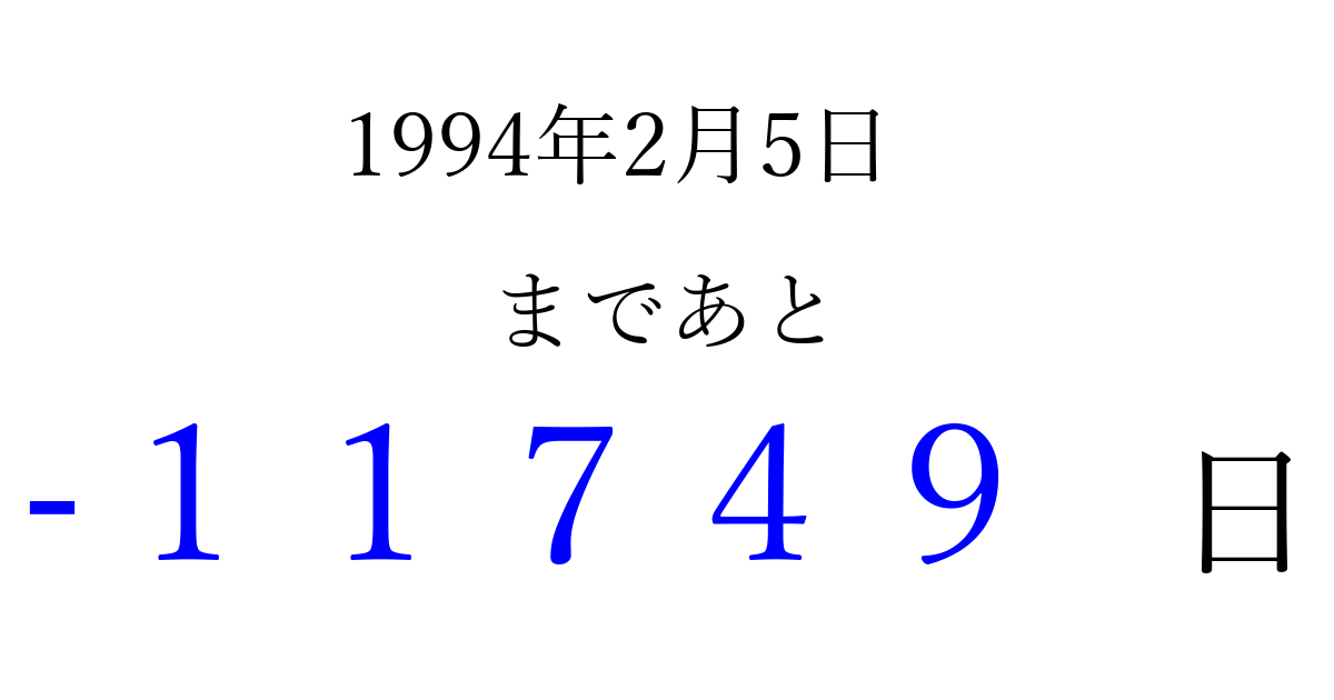 1994年2月5日(土)は もう 00000 日過ぎました 追加すると、トップページからすぐ選べるようになります ※2026/04/07現在の結果です。 最新の状態に更新する ↓シェアして、タイムライン上にカウントダウンを表示しよう!↓ 📤 この結果を共有する Tweet シェア Threads Bluesky 別の日付でカウントダウン 1994年2月のカレンダー このページをブックマークに追加すると、いつでもカウントダウンを確認できます。 (PC: Ctrl+D / Mac: ⌘+D) hitome-notes.comでは以下のページも運営しています。 指定日と期間から日付を計算 | ガチャ確率計算・シミュレーション | プライバシー・ポリシー 運営者:Avocado