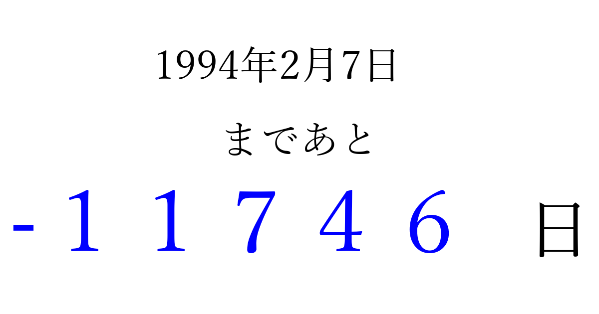 1994年2月7日(月)は もう 00000 日過ぎました 追加すると、トップページからすぐ選べるようになります ※2026/04/06現在の結果です。 最新の状態に更新する ↓シェアして、タイムライン上にカウントダウンを表示しよう!↓ 📤 この結果を共有する Tweet シェア Threads Bluesky 別の日付でカウントダウン 1994年2月のカレンダー このページをブックマークに追加すると、いつでもカウントダウンを確認できます。 (PC: Ctrl+D / Mac: ⌘+D) hitome-notes.comでは以下のページも運営しています。 指定日と期間から日付を計算 | ガチャ確率計算・シミュレーション | プライバシー・ポリシー 運営者:Avocado