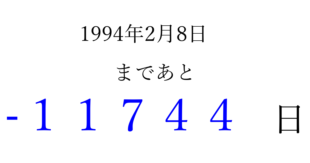 1994年2月8日(火)は もう 00000 日過ぎました 追加すると、トップページからすぐ選べるようになります ※2026/04/05現在の結果です。 最新の状態に更新する ↓シェアして、タイムライン上にカウントダウンを表示しよう!↓ 📤 この結果を共有する Tweet シェア Threads Bluesky 別の日付でカウントダウン 1994年2月のカレンダー このページをブックマークに追加すると、いつでもカウントダウンを確認できます。 (PC: Ctrl+D / Mac: ⌘+D) hitome-notes.comでは以下のページも運営しています。 指定日と期間から日付を計算 | ガチャ確率計算・シミュレーション | プライバシー・ポリシー 運営者:Avocado