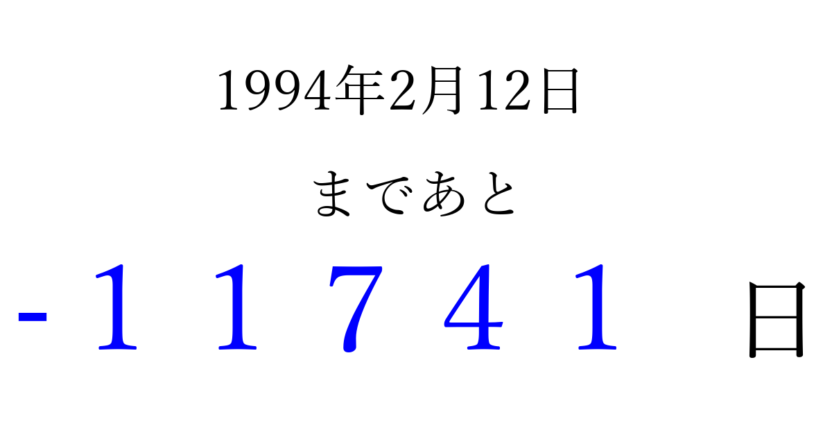 1994年2月12日(土)は もう 00000 日過ぎました 追加すると、トップページからすぐ選べるようになります ※2026/04/06現在の結果です。 最新の状態に更新する ↓シェアして、タイムライン上にカウントダウンを表示しよう!↓ 📤 この結果を共有する Tweet シェア Threads Bluesky 別の日付でカウントダウン 1994年2月のカレンダー このページをブックマークに追加すると、いつでもカウントダウンを確認できます。 (PC: Ctrl+D / Mac: ⌘+D) hitome-notes.comでは以下のページも運営しています。 指定日と期間から日付を計算 | ガチャ確率計算・シミュレーション | プライバシー・ポリシー 運営者:Avocado