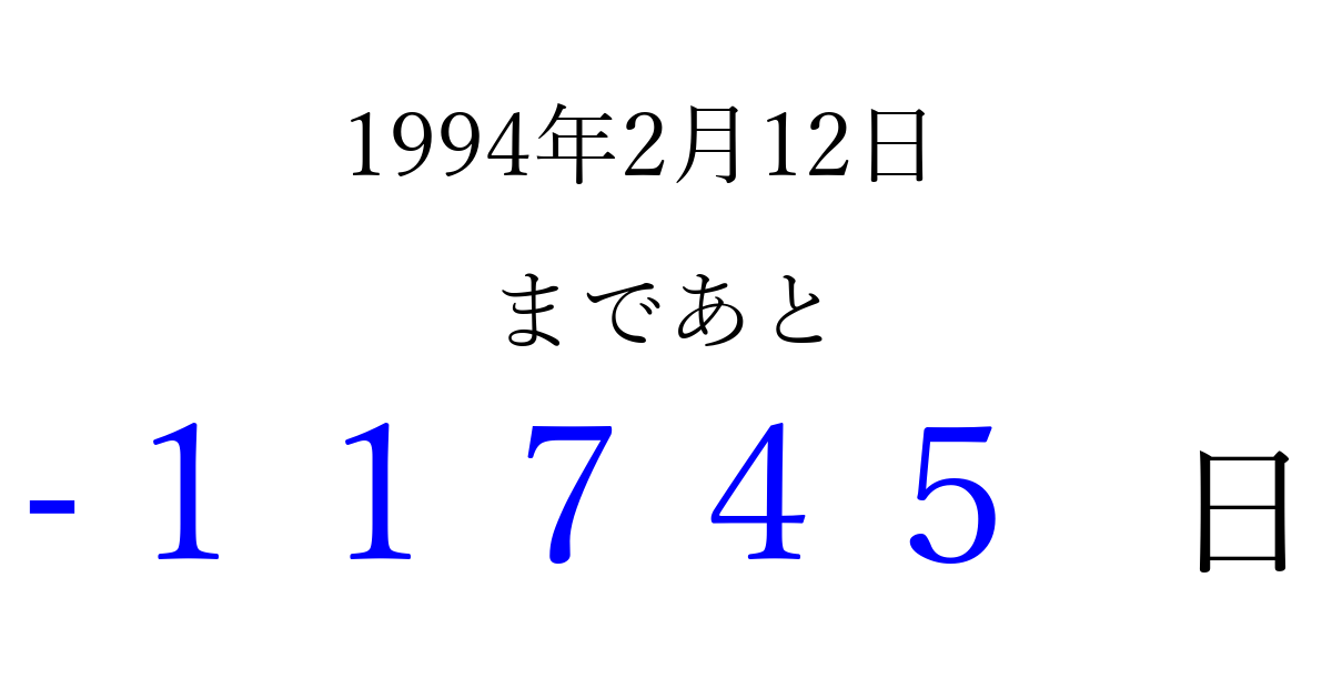1994年2月12日(土)は もう 00000 日過ぎました 追加すると、トップページからすぐ選べるようになります ※2026/04/10現在の結果です。 最新の状態に更新する ↓シェアして、タイムライン上にカウントダウンを表示しよう!↓ 📤 この結果を共有する Tweet シェア Threads Bluesky 別の日付でカウントダウン 1994年2月のカレンダー このページをブックマークに追加すると、いつでもカウントダウンを確認できます。 (PC: Ctrl+D / Mac: ⌘+D) hitome-notes.comでは以下のページも運営しています。 指定日と期間から日付を計算 | ガチャ確率計算・シミュレーション | プライバシー・ポリシー 運営者:Avocado