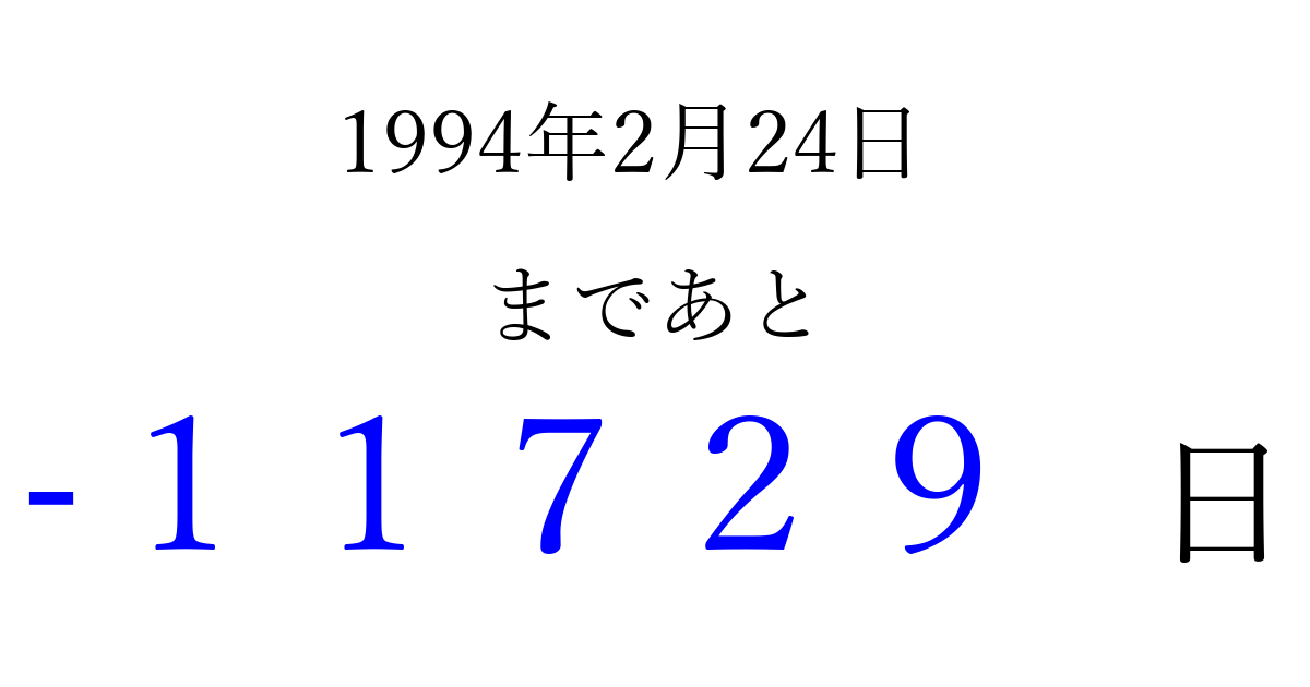 1994年2月24日(木)は もう 00000 日過ぎました 追加すると、トップページからすぐ選べるようになります ※2026/04/06現在の結果です。 最新の状態に更新する ↓シェアして、タイムライン上にカウントダウンを表示しよう!↓ 📤 この結果を共有する Tweet シェア Threads Bluesky 別の日付でカウントダウン 1994年2月のカレンダー このページをブックマークに追加すると、いつでもカウントダウンを確認できます。 (PC: Ctrl+D / Mac: ⌘+D) hitome-notes.comでは以下のページも運営しています。 指定日と期間から日付を計算 | ガチャ確率計算・シミュレーション | プライバシー・ポリシー 運営者:Avocado