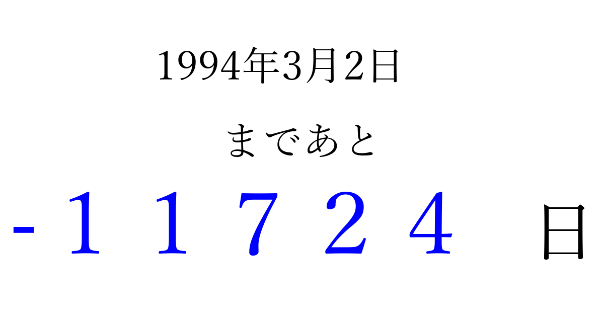 1994年3月2日(水)は もう 00000 日過ぎました 追加すると、トップページからすぐ選べるようになります ※2026/04/07現在の結果です。 最新の状態に更新する ↓シェアして、タイムライン上にカウントダウンを表示しよう!↓ 📤 この結果を共有する Tweet シェア Threads Bluesky 別の日付でカウントダウン 1994年3月のカレンダー このページをブックマークに追加すると、いつでもカウントダウンを確認できます。 (PC: Ctrl+D / Mac: ⌘+D) hitome-notes.comでは以下のページも運営しています。 指定日と期間から日付を計算 | ガチャ確率計算・シミュレーション | プライバシー・ポリシー 運営者:Avocado