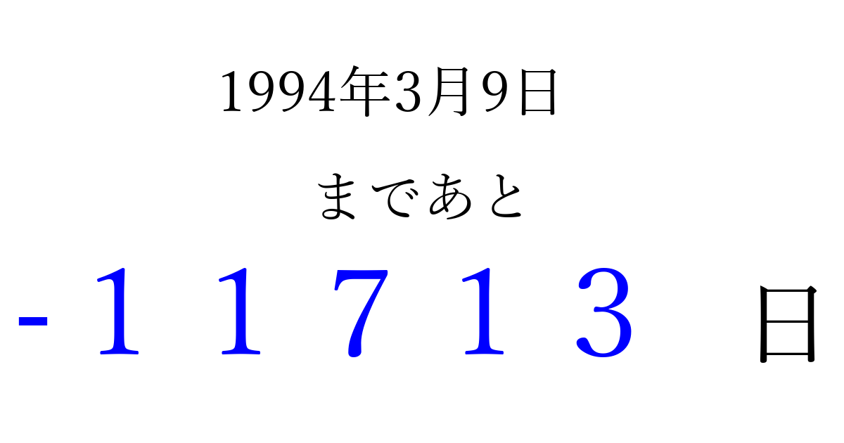 1994年3月9日(水)は もう 00000 日過ぎました 追加すると、トップページからすぐ選べるようになります ※2026/04/03現在の結果です。 最新の状態に更新する ↓シェアして、タイムライン上にカウントダウンを表示しよう!↓ 📤 この結果を共有する Tweet シェア Threads Bluesky 別の日付でカウントダウン 1994年3月のカレンダー このページをブックマークに追加すると、いつでもカウントダウンを確認できます。 (PC: Ctrl+D / Mac: ⌘+D) hitome-notes.comでは以下のページも運営しています。 指定日と期間から日付を計算 | ガチャ確率計算・シミュレーション | プライバシー・ポリシー 運営者:Avocado