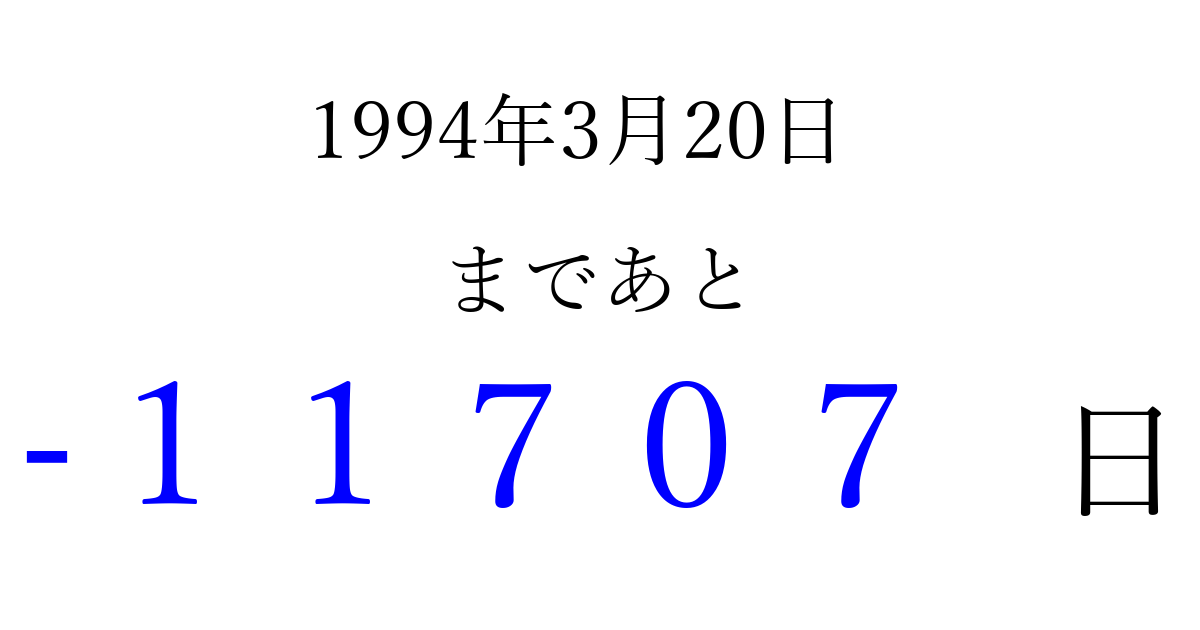 1994年3月20日(日)は もう 00000 日過ぎました 追加すると、トップページからすぐ選べるようになります ※2026/04/08現在の結果です。 最新の状態に更新する ↓シェアして、タイムライン上にカウントダウンを表示しよう!↓ 📤 この結果を共有する Tweet シェア Threads Bluesky 別の日付でカウントダウン 1994年3月のカレンダー このページをブックマークに追加すると、いつでもカウントダウンを確認できます。 (PC: Ctrl+D / Mac: ⌘+D) hitome-notes.comでは以下のページも運営しています。 指定日と期間から日付を計算 | ガチャ確率計算・シミュレーション | プライバシー・ポリシー 運営者:Avocado