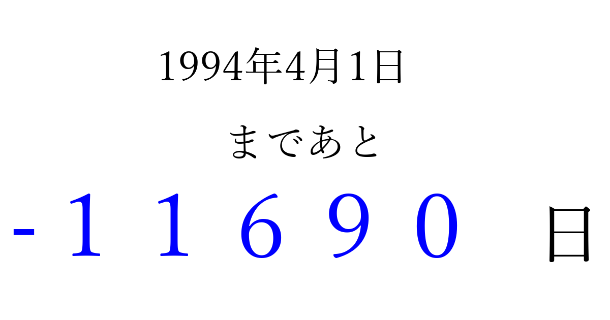 1994年4月1日(金)は もう 00000 日過ぎました 追加すると、トップページからすぐ選べるようになります ※2026/04/03現在の結果です。 最新の状態に更新する ↓シェアして、タイムライン上にカウントダウンを表示しよう!↓ 📤 この結果を共有する Tweet シェア Threads Bluesky 別の日付でカウントダウン 1994年4月のカレンダー このページをブックマークに追加すると、いつでもカウントダウンを確認できます。 (PC: Ctrl+D / Mac: ⌘+D) hitome-notes.comでは以下のページも運営しています。 指定日と期間から日付を計算 | ガチャ確率計算・シミュレーション | プライバシー・ポリシー 運営者:Avocado
