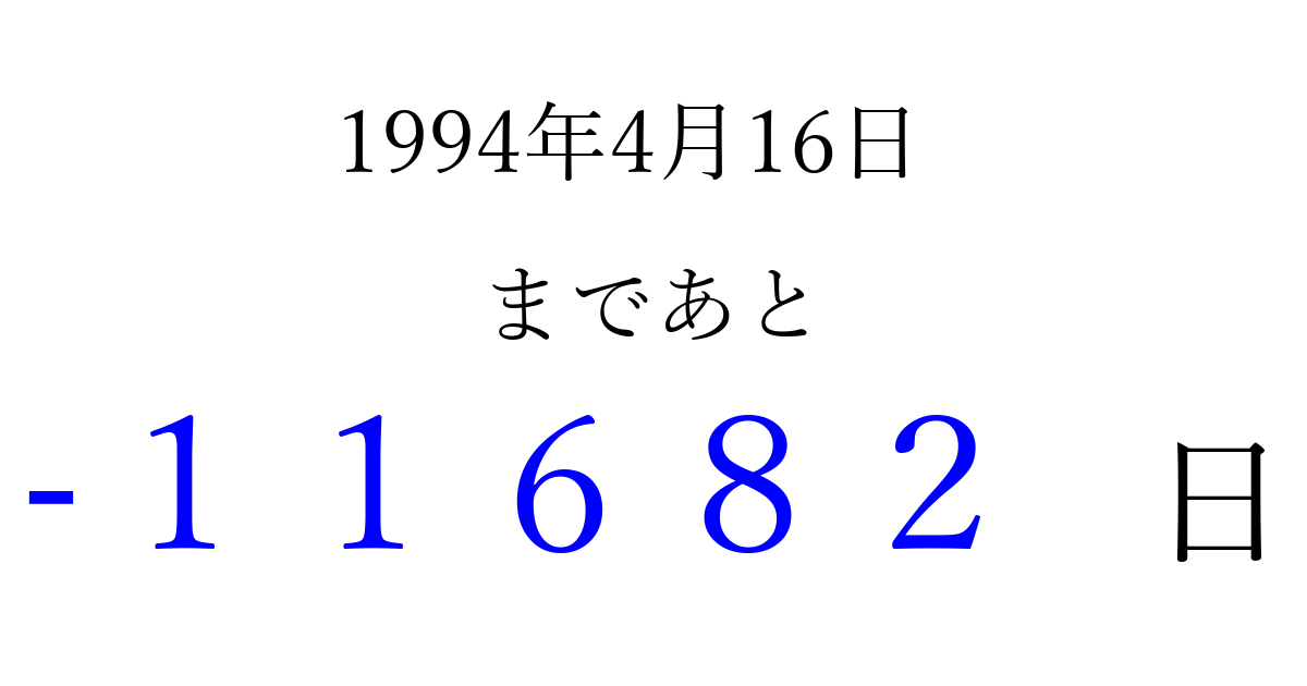 1994年4月16日(土)は もう 00000 日過ぎました 追加すると、トップページからすぐ選べるようになります ※2026/04/10現在の結果です。 最新の状態に更新する ↓シェアして、タイムライン上にカウントダウンを表示しよう!↓ 📤 この結果を共有する Tweet シェア Threads Bluesky 別の日付でカウントダウン 1994年4月のカレンダー このページをブックマークに追加すると、いつでもカウントダウンを確認できます。 (PC: Ctrl+D / Mac: ⌘+D) hitome-notes.comでは以下のページも運営しています。 指定日と期間から日付を計算 | ガチャ確率計算・シミュレーション | プライバシー・ポリシー 運営者:Avocado