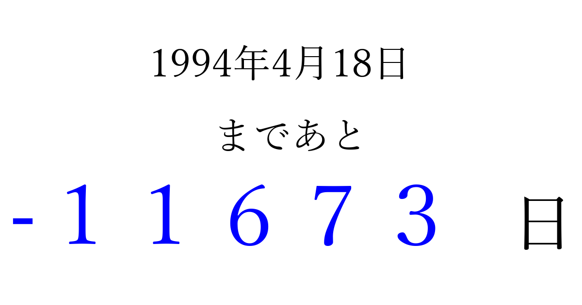 1994年4月18日(月)は もう 00000 日過ぎました 追加すると、トップページからすぐ選べるようになります ※2026/04/03現在の結果です。 最新の状態に更新する ↓シェアして、タイムライン上にカウントダウンを表示しよう!↓ 📤 この結果を共有する Tweet シェア Threads Bluesky 別の日付でカウントダウン 1994年4月のカレンダー このページをブックマークに追加すると、いつでもカウントダウンを確認できます。 (PC: Ctrl+D / Mac: ⌘+D) hitome-notes.comでは以下のページも運営しています。 指定日と期間から日付を計算 | ガチャ確率計算・シミュレーション | プライバシー・ポリシー 運営者:Avocado