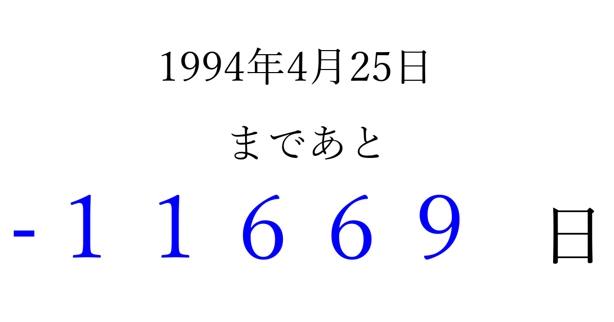 1994年4月25日(月)は もう 00000 日過ぎました 追加すると、トップページからすぐ選べるようになります ※2026/04/06現在の結果です。 最新の状態に更新する ↓シェアして、タイムライン上にカウントダウンを表示しよう!↓ 📤 この結果を共有する Tweet シェア Threads Bluesky 別の日付でカウントダウン 1994年4月のカレンダー このページをブックマークに追加すると、いつでもカウントダウンを確認できます。 (PC: Ctrl+D / Mac: ⌘+D) hitome-notes.comでは以下のページも運営しています。 指定日と期間から日付を計算 | ガチャ確率計算・シミュレーション | プライバシー・ポリシー 運営者:Avocado