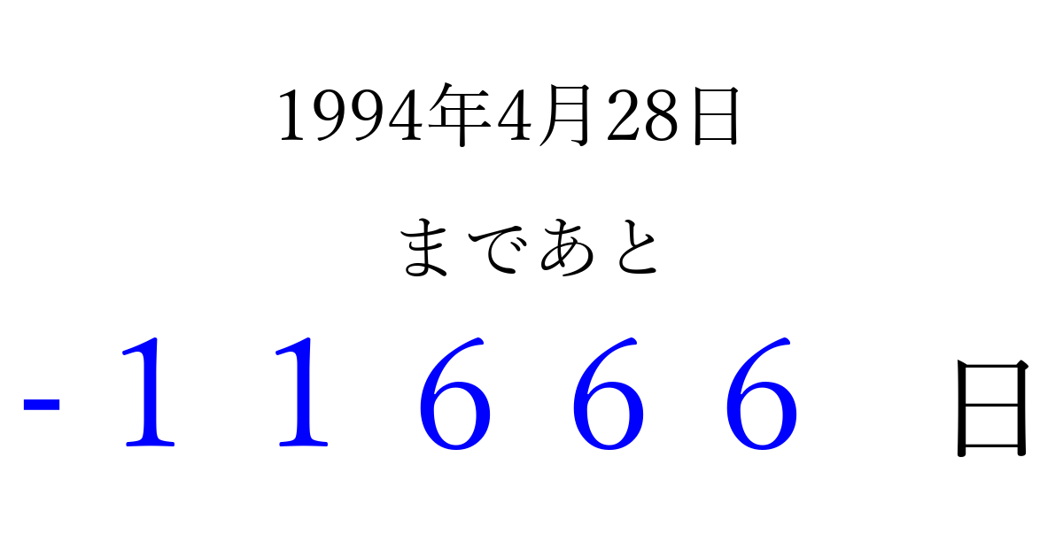 1994年4月28日(木)は もう 00000 日過ぎました 追加すると、トップページからすぐ選べるようになります ※2026/04/06現在の結果です。 最新の状態に更新する ↓シェアして、タイムライン上にカウントダウンを表示しよう!↓ 📤 この結果を共有する Tweet シェア Threads Bluesky 別の日付でカウントダウン 1994年4月のカレンダー このページをブックマークに追加すると、いつでもカウントダウンを確認できます。 (PC: Ctrl+D / Mac: ⌘+D) hitome-notes.comでは以下のページも運営しています。 指定日と期間から日付を計算 | ガチャ確率計算・シミュレーション | プライバシー・ポリシー 運営者:Avocado