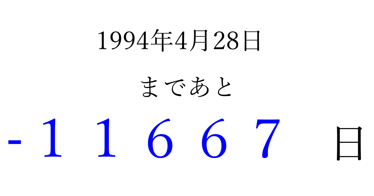 1994年4月28日(木)は もう 00000 日過ぎました 追加すると、トップページからすぐ選べるようになります ※2026/04/07現在の結果です。 最新の状態に更新する ↓シェアして、タイムライン上にカウントダウンを表示しよう!↓ 📤 この結果を共有する Tweet シェア Threads Bluesky 別の日付でカウントダウン 1994年4月のカレンダー このページをブックマークに追加すると、いつでもカウントダウンを確認できます。 (PC: Ctrl+D / Mac: ⌘+D) hitome-notes.comでは以下のページも運営しています。 指定日と期間から日付を計算 | ガチャ確率計算・シミュレーション | プライバシー・ポリシー 運営者:Avocado