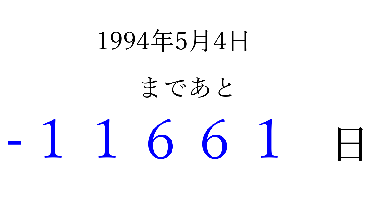 1994年5月4日(水)は もう 00000 日過ぎました 追加すると、トップページからすぐ選べるようになります ※2026/04/07現在の結果です。 最新の状態に更新する ↓シェアして、タイムライン上にカウントダウンを表示しよう!↓ 📤 この結果を共有する Tweet シェア Threads Bluesky 別の日付でカウントダウン 1994年5月のカレンダー このページをブックマークに追加すると、いつでもカウントダウンを確認できます。 (PC: Ctrl+D / Mac: ⌘+D) hitome-notes.comでは以下のページも運営しています。 指定日と期間から日付を計算 | ガチャ確率計算・シミュレーション | プライバシー・ポリシー 運営者:Avocado