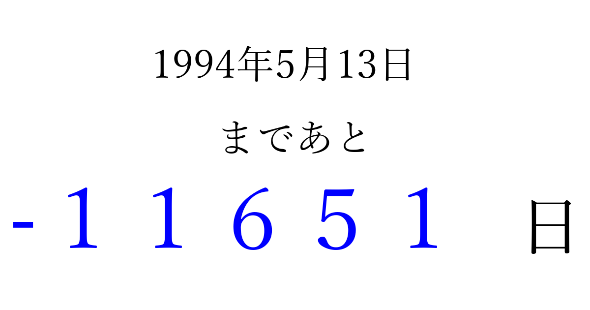 1994年5月13日(金)は もう 00000 日過ぎました 追加すると、トップページからすぐ選べるようになります ※2026/04/06現在の結果です。 最新の状態に更新する ↓シェアして、タイムライン上にカウントダウンを表示しよう!↓ 📤 この結果を共有する Tweet シェア Threads Bluesky 別の日付でカウントダウン 1994年5月のカレンダー このページをブックマークに追加すると、いつでもカウントダウンを確認できます。 (PC: Ctrl+D / Mac: ⌘+D) hitome-notes.comでは以下のページも運営しています。 指定日と期間から日付を計算 | ガチャ確率計算・シミュレーション | プライバシー・ポリシー 運営者:Avocado