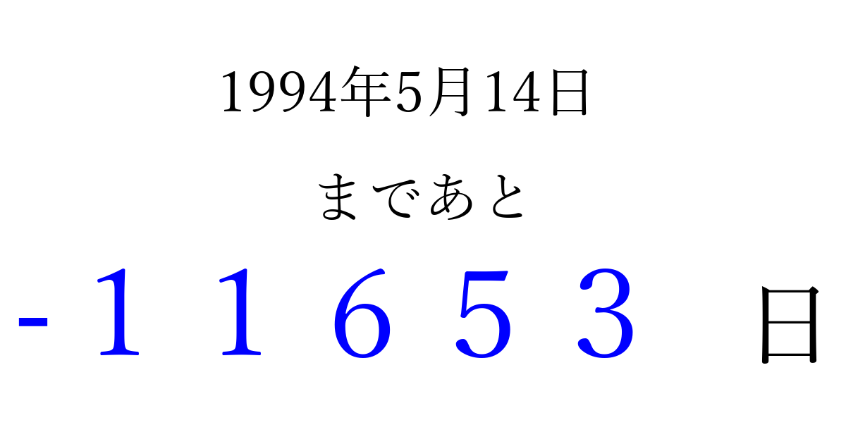 1994年5月14日(土)は もう 00000 日過ぎました 追加すると、トップページからすぐ選べるようになります ※2026/04/09現在の結果です。 最新の状態に更新する ↓シェアして、タイムライン上にカウントダウンを表示しよう!↓ 📤 この結果を共有する Tweet シェア Threads Bluesky 別の日付でカウントダウン 1994年5月のカレンダー このページをブックマークに追加すると、いつでもカウントダウンを確認できます。 (PC: Ctrl+D / Mac: ⌘+D) hitome-notes.comでは以下のページも運営しています。 指定日と期間から日付を計算 | ガチャ確率計算・シミュレーション | プライバシー・ポリシー 運営者:Avocado