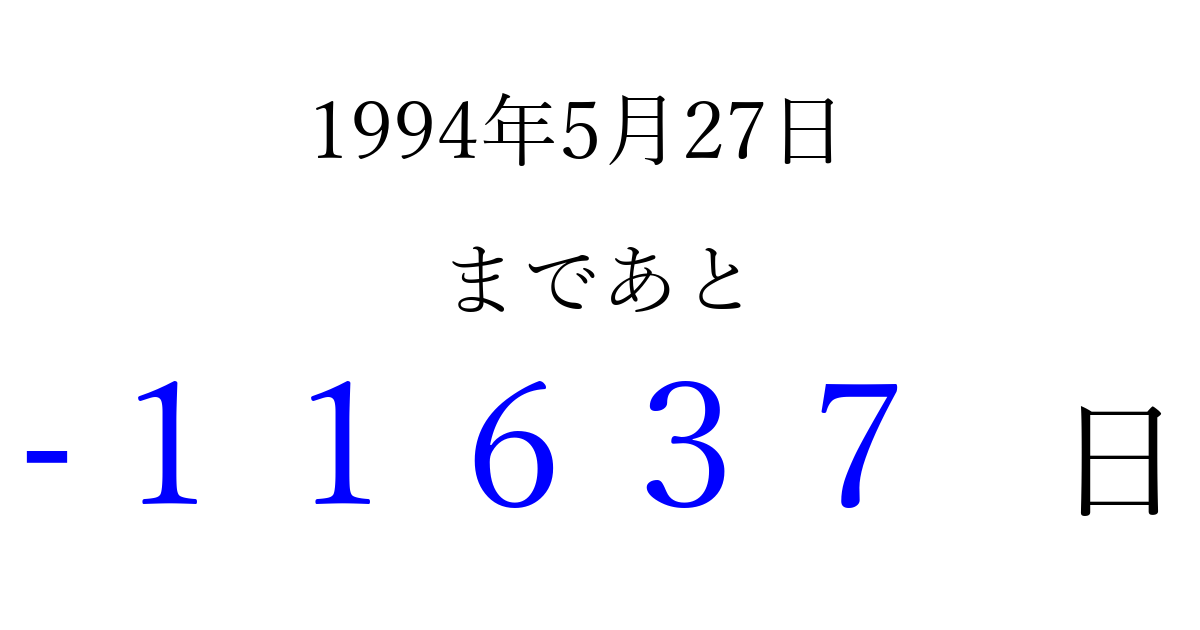 1994年5月27日(金)は もう 00000 日過ぎました 追加すると、トップページからすぐ選べるようになります ※2026/04/06現在の結果です。 最新の状態に更新する ↓シェアして、タイムライン上にカウントダウンを表示しよう!↓ 📤 この結果を共有する Tweet シェア Threads Bluesky 別の日付でカウントダウン 1994年5月のカレンダー このページをブックマークに追加すると、いつでもカウントダウンを確認できます。 (PC: Ctrl+D / Mac: ⌘+D) hitome-notes.comでは以下のページも運営しています。 指定日と期間から日付を計算 | ガチャ確率計算・シミュレーション | プライバシー・ポリシー 運営者:Avocado