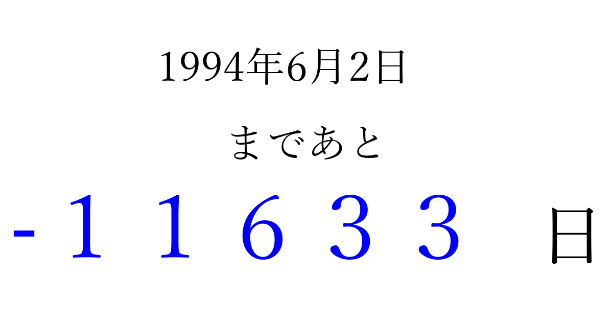 1994年6月2日(木)は もう 00000 日過ぎました 追加すると、トップページからすぐ選べるようになります ※2026/04/08現在の結果です。 最新の状態に更新する ↓シェアして、タイムライン上にカウントダウンを表示しよう!↓ 📤 この結果を共有する Tweet シェア Threads Bluesky 別の日付でカウントダウン 1994年6月のカレンダー このページをブックマークに追加すると、いつでもカウントダウンを確認できます。 (PC: Ctrl+D / Mac: ⌘+D) hitome-notes.comでは以下のページも運営しています。 指定日と期間から日付を計算 | ガチャ確率計算・シミュレーション | プライバシー・ポリシー 運営者:Avocado