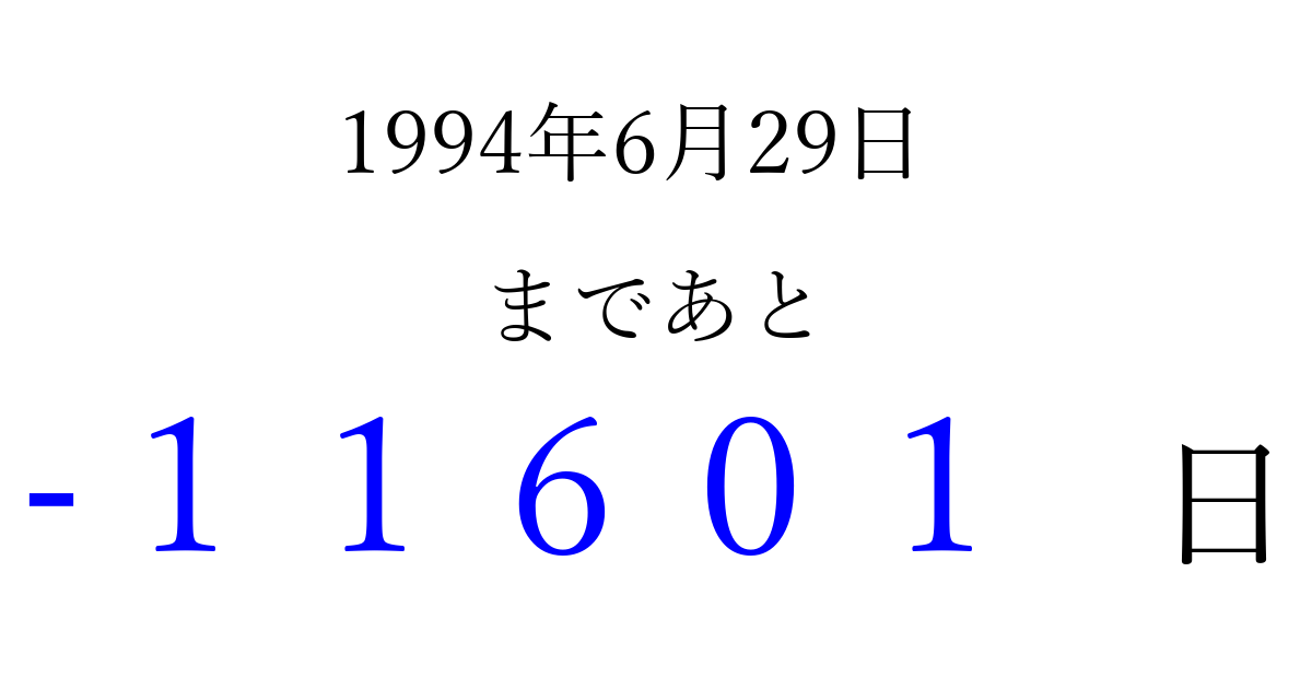 1994年6月29日(水)は もう 00000 日過ぎました 追加すると、トップページからすぐ選べるようになります ※2026/04/03現在の結果です。 最新の状態に更新する ↓シェアして、タイムライン上にカウントダウンを表示しよう!↓ 📤 この結果を共有する Tweet シェア Threads Bluesky 別の日付でカウントダウン 1994年6月のカレンダー このページをブックマークに追加すると、いつでもカウントダウンを確認できます。 (PC: Ctrl+D / Mac: ⌘+D) hitome-notes.comでは以下のページも運営しています。 指定日と期間から日付を計算 | ガチャ確率計算・シミュレーション | プライバシー・ポリシー 運営者:Avocado