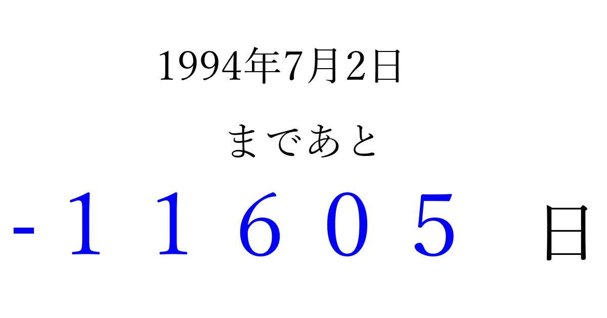 1994年7月2日(土)は もう 00000 日過ぎました 追加すると、トップページからすぐ選べるようになります ※2026/04/10現在の結果です。 最新の状態に更新する ↓シェアして、タイムライン上にカウントダウンを表示しよう!↓ 📤 この結果を共有する Tweet シェア Threads Bluesky 別の日付でカウントダウン 1994年7月のカレンダー このページをブックマークに追加すると、いつでもカウントダウンを確認できます。 (PC: Ctrl+D / Mac: ⌘+D) hitome-notes.comでは以下のページも運営しています。 指定日と期間から日付を計算 | ガチャ確率計算・シミュレーション | プライバシー・ポリシー 運営者:Avocado