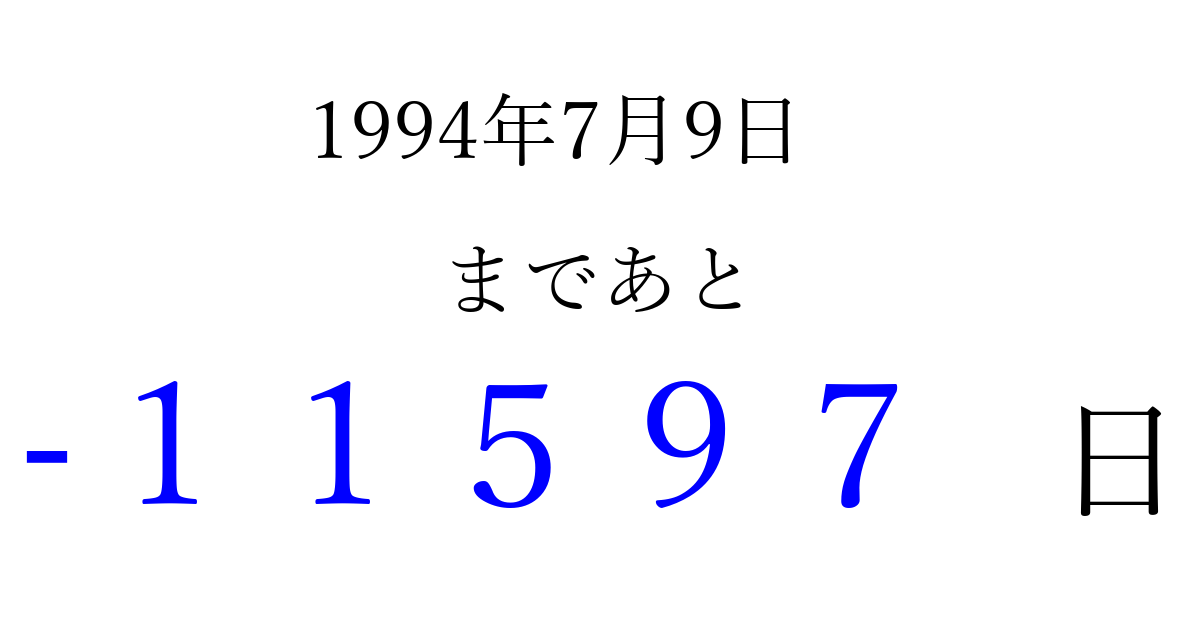 1994年7月9日(土)は もう 00000 日過ぎました 追加すると、トップページからすぐ選べるようになります ※2026/04/09現在の結果です。 最新の状態に更新する ↓シェアして、タイムライン上にカウントダウンを表示しよう!↓ 📤 この結果を共有する Tweet シェア Threads Bluesky 別の日付でカウントダウン 1994年7月のカレンダー このページをブックマークに追加すると、いつでもカウントダウンを確認できます。 (PC: Ctrl+D / Mac: ⌘+D) hitome-notes.comでは以下のページも運営しています。 指定日と期間から日付を計算 | ガチャ確率計算・シミュレーション | プライバシー・ポリシー 運営者:Avocado