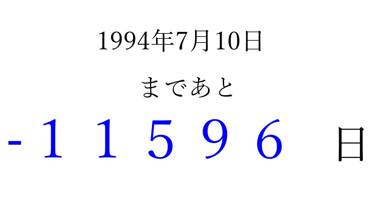 1994年7月10日(日)は もう 00000 日過ぎました 追加すると、トップページからすぐ選べるようになります ※2026/04/09現在の結果です。 最新の状態に更新する ↓シェアして、タイムライン上にカウントダウンを表示しよう!↓ 📤 この結果を共有する Tweet シェア Threads Bluesky 別の日付でカウントダウン 1994年7月のカレンダー このページをブックマークに追加すると、いつでもカウントダウンを確認できます。 (PC: Ctrl+D / Mac: ⌘+D) hitome-notes.comでは以下のページも運営しています。 指定日と期間から日付を計算 | ガチャ確率計算・シミュレーション | プライバシー・ポリシー 運営者:Avocado
