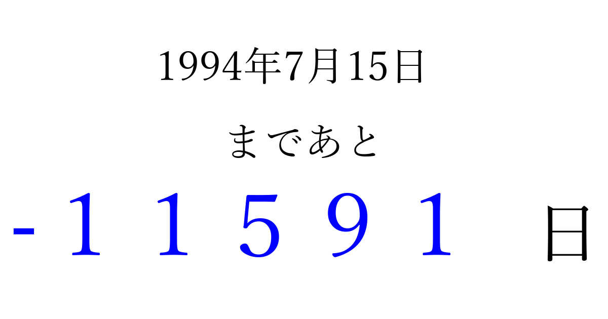 1994年7月15日(金)は もう 00000 日過ぎました 追加すると、トップページからすぐ選べるようになります ※2026/04/09現在の結果です。 最新の状態に更新する ↓シェアして、タイムライン上にカウントダウンを表示しよう!↓ 📤 この結果を共有する Tweet シェア Threads Bluesky 別の日付でカウントダウン 1994年7月のカレンダー このページをブックマークに追加すると、いつでもカウントダウンを確認できます。 (PC: Ctrl+D / Mac: ⌘+D) hitome-notes.comでは以下のページも運営しています。 指定日と期間から日付を計算 | ガチャ確率計算・シミュレーション | プライバシー・ポリシー 運営者:Avocado