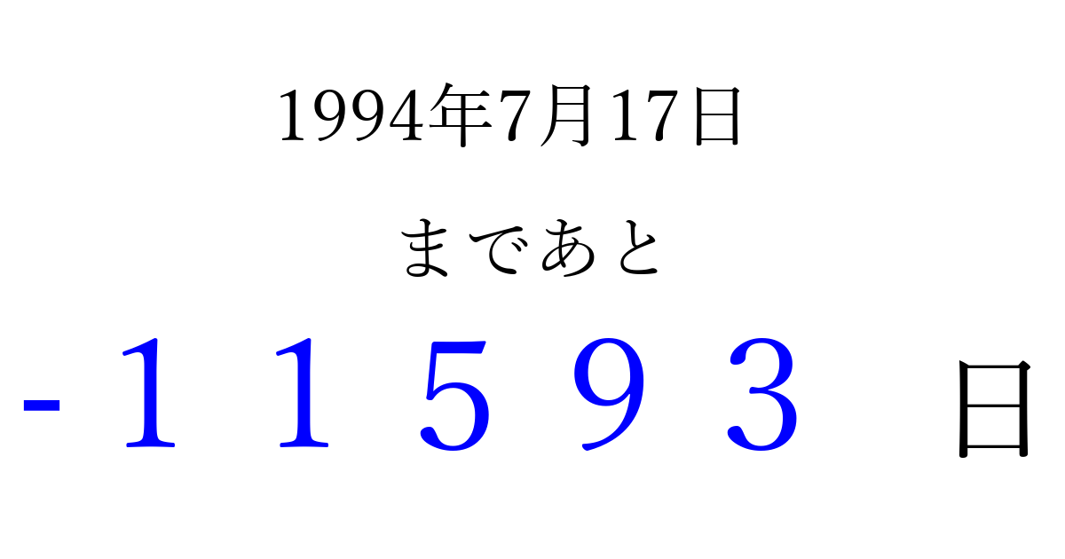 1994年7月17日(日)は もう 00000 日過ぎました 追加すると、トップページからすぐ選べるようになります ※2026/04/13現在の結果です。 最新の状態に更新する ↓シェアして、タイムライン上にカウントダウンを表示しよう!↓ 📤 この結果を共有する Tweet シェア Threads Bluesky 別の日付でカウントダウン 1994年7月のカレンダー このページをブックマークに追加すると、いつでもカウントダウンを確認できます。 (PC: Ctrl+D / Mac: ⌘+D) hitome-notes.comでは以下のページも運営しています。 指定日と期間から日付を計算 | ガチャ確率計算・シミュレーション | プライバシー・ポリシー 運営者:Avocado