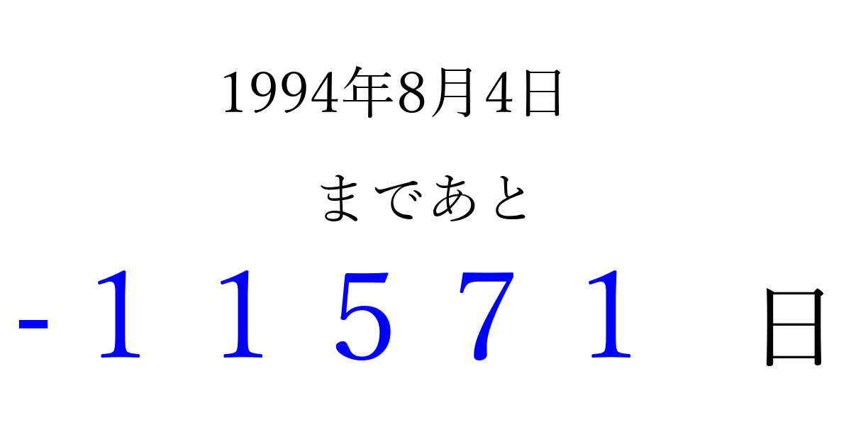 1994年8月4日(木)は もう 00000 日過ぎました 追加すると、トップページからすぐ選べるようになります ※2026/04/09現在の結果です。 最新の状態に更新する ↓シェアして、タイムライン上にカウントダウンを表示しよう!↓ 📤 この結果を共有する Tweet シェア Threads Bluesky 別の日付でカウントダウン 1994年8月のカレンダー このページをブックマークに追加すると、いつでもカウントダウンを確認できます。 (PC: Ctrl+D / Mac: ⌘+D) hitome-notes.comでは以下のページも運営しています。 指定日と期間から日付を計算 | ガチャ確率計算・シミュレーション | プライバシー・ポリシー 運営者:Avocado