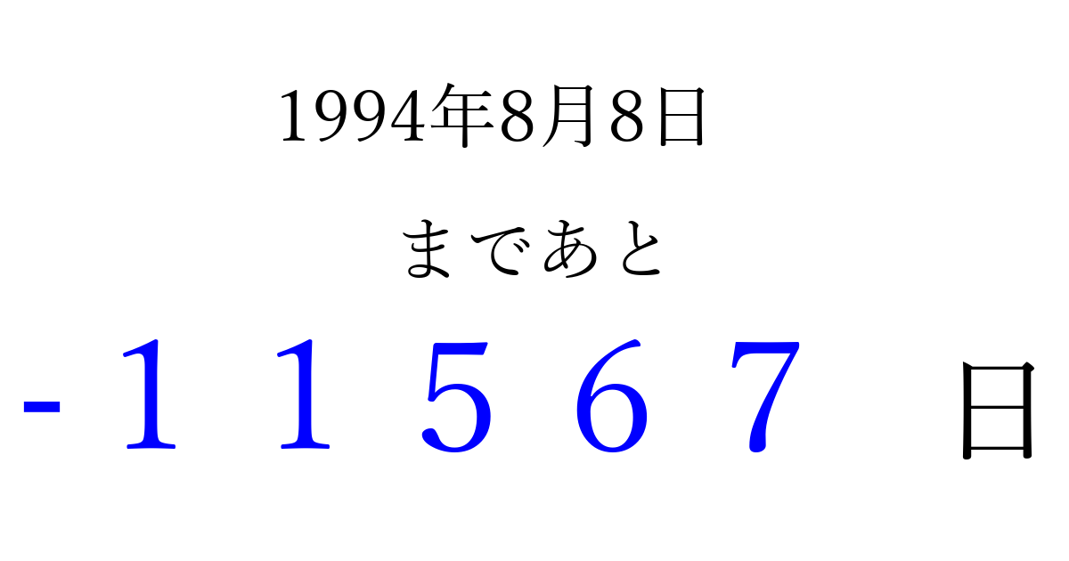 1994年8月8日(月)は もう 00000 日過ぎました 追加すると、トップページからすぐ選べるようになります ※2026/04/09現在の結果です。 最新の状態に更新する ↓シェアして、タイムライン上にカウントダウンを表示しよう!↓ 📤 この結果を共有する Tweet シェア Threads Bluesky 別の日付でカウントダウン 1994年8月のカレンダー このページをブックマークに追加すると、いつでもカウントダウンを確認できます。 (PC: Ctrl+D / Mac: ⌘+D) hitome-notes.comでは以下のページも運営しています。 指定日と期間から日付を計算 | ガチャ確率計算・シミュレーション | プライバシー・ポリシー 運営者:Avocado
