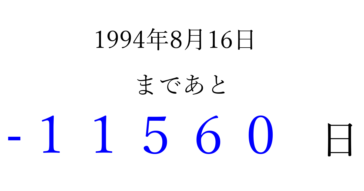 1994年8月16日(火)は もう 00000 日過ぎました 追加すると、トップページからすぐ選べるようになります ※2026/04/10現在の結果です。 最新の状態に更新する ↓シェアして、タイムライン上にカウントダウンを表示しよう!↓ 📤 この結果を共有する Tweet シェア Threads Bluesky 別の日付でカウントダウン 1994年8月のカレンダー このページをブックマークに追加すると、いつでもカウントダウンを確認できます。 (PC: Ctrl+D / Mac: ⌘+D) hitome-notes.comでは以下のページも運営しています。 指定日と期間から日付を計算 | ガチャ確率計算・シミュレーション | プライバシー・ポリシー 運営者:Avocado