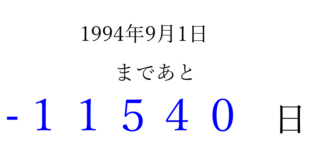 1994年9月1日(木)は もう 00000 日過ぎました 追加すると、トップページからすぐ選べるようになります ※2026/04/06現在の結果です。 最新の状態に更新する ↓シェアして、タイムライン上にカウントダウンを表示しよう!↓ 📤 この結果を共有する Tweet シェア Threads Bluesky 別の日付でカウントダウン 1994年9月のカレンダー このページをブックマークに追加すると、いつでもカウントダウンを確認できます。 (PC: Ctrl+D / Mac: ⌘+D) hitome-notes.comでは以下のページも運営しています。 指定日と期間から日付を計算 | ガチャ確率計算・シミュレーション | プライバシー・ポリシー 運営者:Avocado