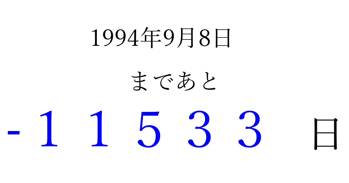 1994年9月8日(木)は もう 00000 日過ぎました 追加すると、トップページからすぐ選べるようになります ※2026/04/06現在の結果です。 最新の状態に更新する ↓シェアして、タイムライン上にカウントダウンを表示しよう!↓ 📤 この結果を共有する Tweet シェア Threads Bluesky 別の日付でカウントダウン 1994年9月のカレンダー このページをブックマークに追加すると、いつでもカウントダウンを確認できます。 (PC: Ctrl+D / Mac: ⌘+D) hitome-notes.comでは以下のページも運営しています。 指定日と期間から日付を計算 | ガチャ確率計算・シミュレーション | プライバシー・ポリシー 運営者:Avocado