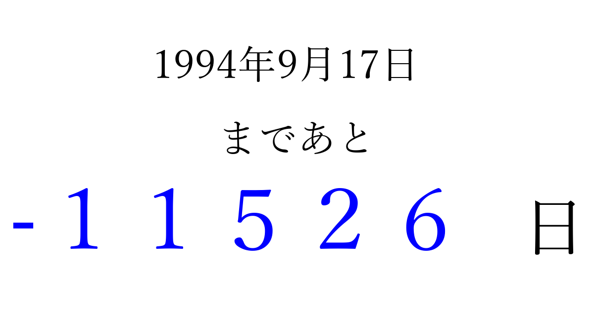 1994年9月17日(土)は もう 00000 日過ぎました 追加すると、トップページからすぐ選べるようになります ※2026/04/08現在の結果です。 最新の状態に更新する ↓シェアして、タイムライン上にカウントダウンを表示しよう!↓ 📤 この結果を共有する Tweet シェア Threads Bluesky 別の日付でカウントダウン 1994年9月のカレンダー このページをブックマークに追加すると、いつでもカウントダウンを確認できます。 (PC: Ctrl+D / Mac: ⌘+D) hitome-notes.comでは以下のページも運営しています。 指定日と期間から日付を計算 | ガチャ確率計算・シミュレーション | プライバシー・ポリシー 運営者:Avocado
