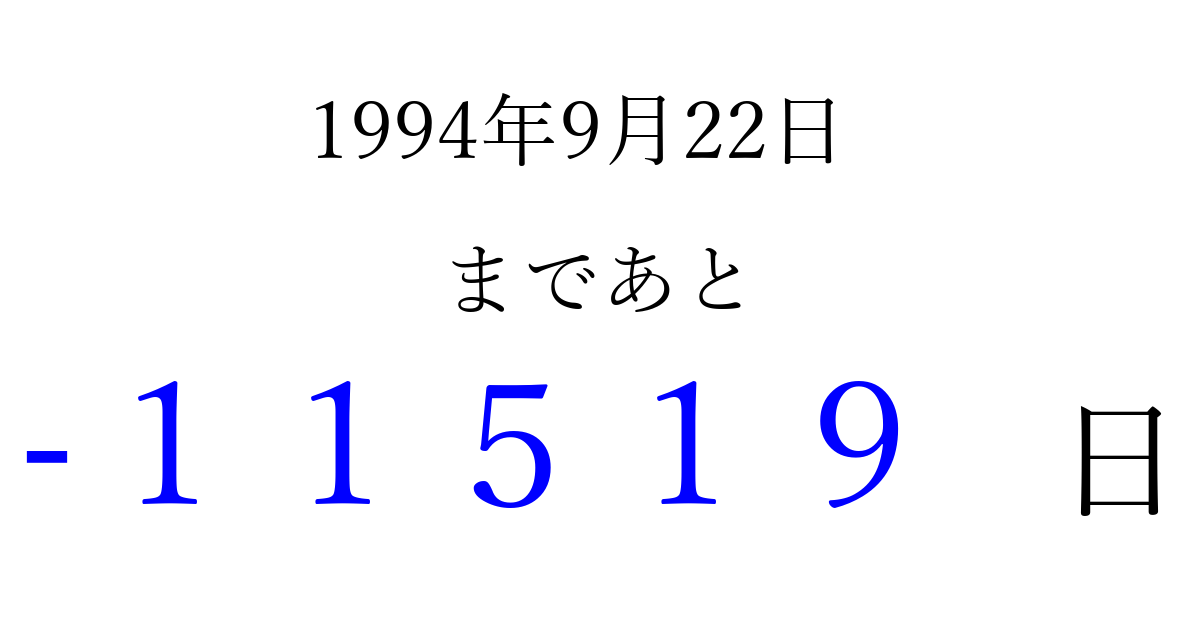 1994年9月22日(木)は もう 00000 日過ぎました 追加すると、トップページからすぐ選べるようになります ※2026/04/06現在の結果です。 最新の状態に更新する ↓シェアして、タイムライン上にカウントダウンを表示しよう!↓ 📤 この結果を共有する Tweet シェア Threads Bluesky 別の日付でカウントダウン 1994年9月のカレンダー このページをブックマークに追加すると、いつでもカウントダウンを確認できます。 (PC: Ctrl+D / Mac: ⌘+D) hitome-notes.comでは以下のページも運営しています。 指定日と期間から日付を計算 | ガチャ確率計算・シミュレーション | プライバシー・ポリシー 運営者:Avocado