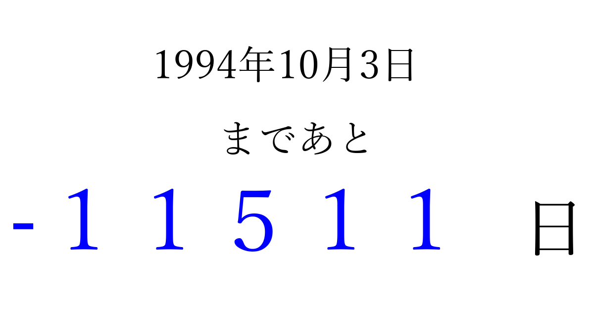 1994年10月3日(月)は もう 00000 日過ぎました 追加すると、トップページからすぐ選べるようになります ※2026/04/09現在の結果です。 最新の状態に更新する ↓シェアして、タイムライン上にカウントダウンを表示しよう!↓ 📤 この結果を共有する Tweet シェア Threads Bluesky 別の日付でカウントダウン 1994年10月のカレンダー このページをブックマークに追加すると、いつでもカウントダウンを確認できます。 (PC: Ctrl+D / Mac: ⌘+D) hitome-notes.comでは以下のページも運営しています。 指定日と期間から日付を計算 | ガチャ確率計算・シミュレーション | プライバシー・ポリシー 運営者:Avocado
