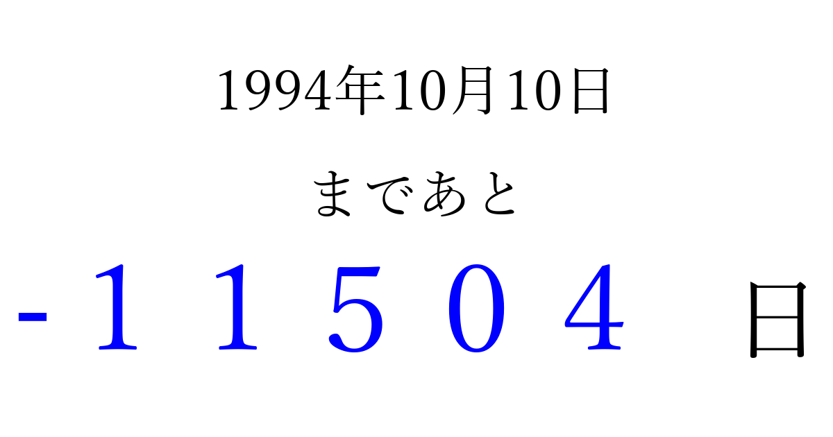 1994年10月10日(月)は もう 00000 日過ぎました 追加すると、トップページからすぐ選べるようになります ※2026/04/09現在の結果です。 最新の状態に更新する ↓シェアして、タイムライン上にカウントダウンを表示しよう!↓ 📤 この結果を共有する Tweet シェア Threads Bluesky 別の日付でカウントダウン 1994年10月のカレンダー このページをブックマークに追加すると、いつでもカウントダウンを確認できます。 (PC: Ctrl+D / Mac: ⌘+D) hitome-notes.comでは以下のページも運営しています。 指定日と期間から日付を計算 | ガチャ確率計算・シミュレーション | プライバシー・ポリシー 運営者:Avocado