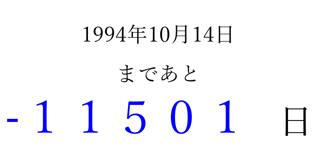 1994年10月14日(金)は もう 00000 日過ぎました 追加すると、トップページからすぐ選べるようになります ※2026/04/10現在の結果です。 最新の状態に更新する ↓シェアして、タイムライン上にカウントダウンを表示しよう!↓ 📤 この結果を共有する Tweet シェア Threads Bluesky 別の日付でカウントダウン 1994年10月のカレンダー このページをブックマークに追加すると、いつでもカウントダウンを確認できます。 (PC: Ctrl+D / Mac: ⌘+D) hitome-notes.comでは以下のページも運営しています。 指定日と期間から日付を計算 | ガチャ確率計算・シミュレーション | プライバシー・ポリシー 運営者:Avocado