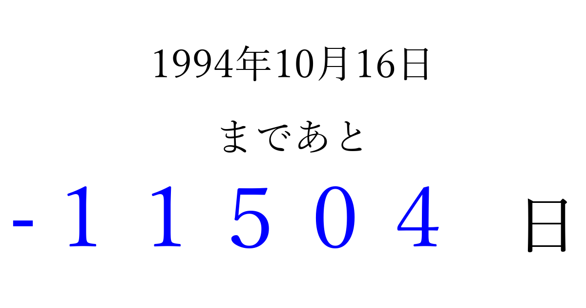 1994年10月16日(日)は もう 00000 日過ぎました 追加すると、トップページからすぐ選べるようになります ※2026/04/15現在の結果です。 最新の状態に更新する ↓シェアして、タイムライン上にカウントダウンを表示しよう!↓ 📤 この結果を共有する Tweet シェア Threads Bluesky 別の日付でカウントダウン 1994年10月のカレンダー このページをブックマークに追加すると、いつでもカウントダウンを確認できます。 (PC: Ctrl+D / Mac: ⌘+D) hitome-notes.comでは以下のページも運営しています。 指定日と期間から日付を計算 | ガチャ確率計算・シミュレーション | プライバシー・ポリシー 運営者:Avocado