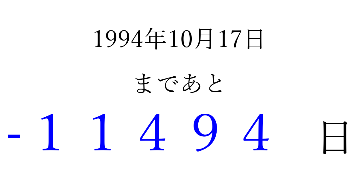 1994年10月17日(月)は もう 00000 日過ぎました 追加すると、トップページからすぐ選べるようになります ※2026/04/06現在の結果です。 最新の状態に更新する ↓シェアして、タイムライン上にカウントダウンを表示しよう!↓ 📤 この結果を共有する Tweet シェア Threads Bluesky 別の日付でカウントダウン 1994年10月のカレンダー このページをブックマークに追加すると、いつでもカウントダウンを確認できます。 (PC: Ctrl+D / Mac: ⌘+D) hitome-notes.comでは以下のページも運営しています。 指定日と期間から日付を計算 | ガチャ確率計算・シミュレーション | プライバシー・ポリシー 運営者:Avocado