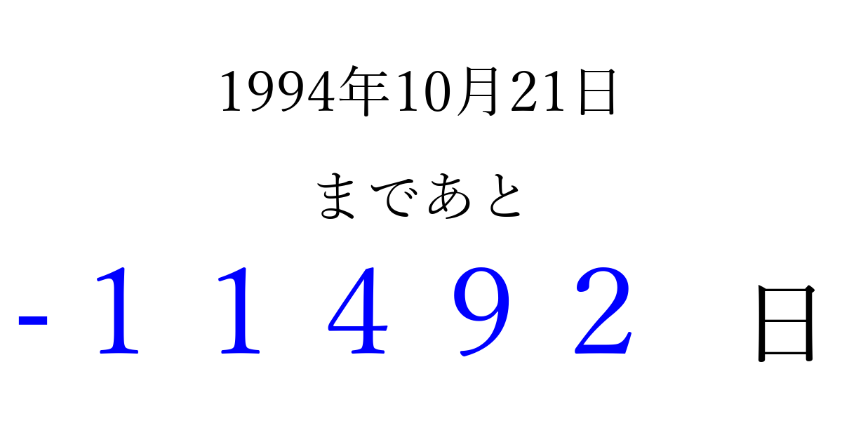 1994年10月21日(金)は もう 00000 日過ぎました 追加すると、トップページからすぐ選べるようになります ※2026/04/08現在の結果です。 最新の状態に更新する ↓シェアして、タイムライン上にカウントダウンを表示しよう!↓ 📤 この結果を共有する Tweet シェア Threads Bluesky 別の日付でカウントダウン 1994年10月のカレンダー このページをブックマークに追加すると、いつでもカウントダウンを確認できます。 (PC: Ctrl+D / Mac: ⌘+D) hitome-notes.comでは以下のページも運営しています。 指定日と期間から日付を計算 | ガチャ確率計算・シミュレーション | プライバシー・ポリシー 運営者:Avocado