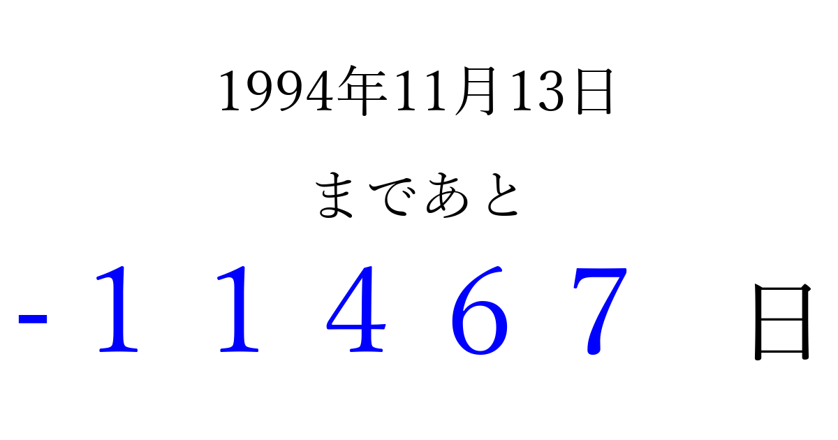 1994年11月13日(日)は もう 00000 日過ぎました 追加すると、トップページからすぐ選べるようになります ※2026/04/06現在の結果です。 最新の状態に更新する ↓シェアして、タイムライン上にカウントダウンを表示しよう!↓ 📤 この結果を共有する Tweet シェア Threads Bluesky 別の日付でカウントダウン 1994年11月のカレンダー このページをブックマークに追加すると、いつでもカウントダウンを確認できます。 (PC: Ctrl+D / Mac: ⌘+D) hitome-notes.comでは以下のページも運営しています。 指定日と期間から日付を計算 | ガチャ確率計算・シミュレーション | プライバシー・ポリシー 運営者:Avocado