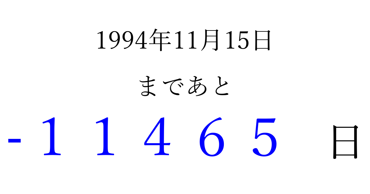 1994年11月15日(火)は もう 00000 日過ぎました 追加すると、トップページからすぐ選べるようになります ※2026/04/06現在の結果です。 最新の状態に更新する ↓シェアして、タイムライン上にカウントダウンを表示しよう!↓ 📤 この結果を共有する Tweet シェア Threads Bluesky 別の日付でカウントダウン 1994年11月のカレンダー このページをブックマークに追加すると、いつでもカウントダウンを確認できます。 (PC: Ctrl+D / Mac: ⌘+D) hitome-notes.comでは以下のページも運営しています。 指定日と期間から日付を計算 | ガチャ確率計算・シミュレーション | プライバシー・ポリシー 運営者:Avocado
