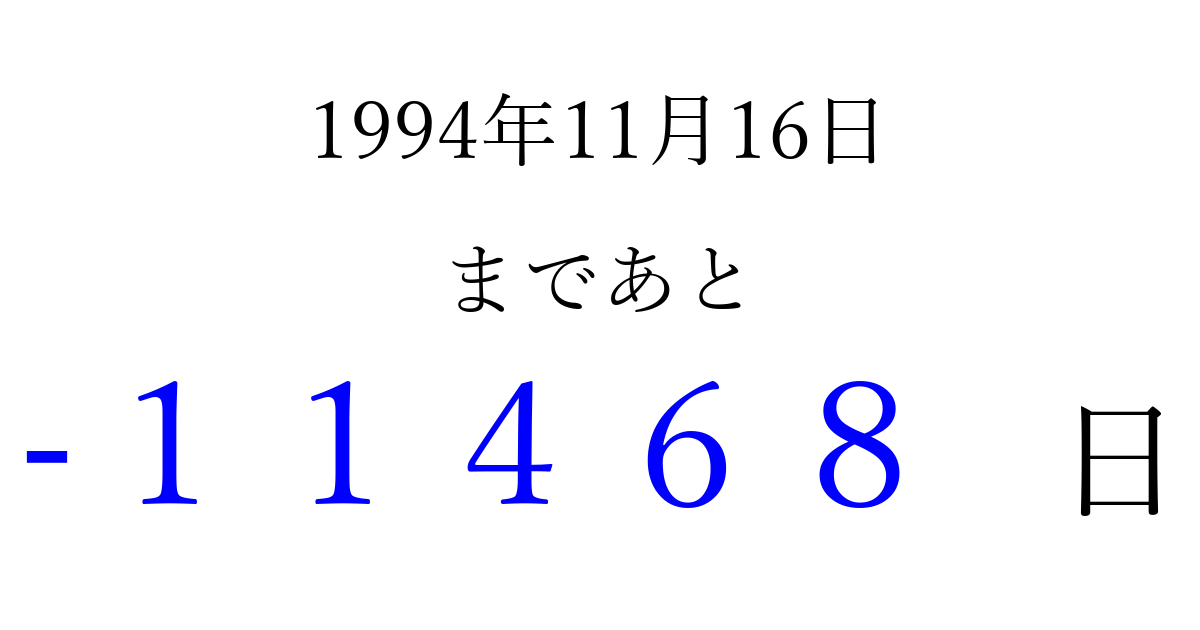 1994年11月16日(水)は もう 00000 日過ぎました 追加すると、トップページからすぐ選べるようになります ※2026/04/10現在の結果です。 最新の状態に更新する ↓シェアして、タイムライン上にカウントダウンを表示しよう!↓ 📤 この結果を共有する Tweet シェア Threads Bluesky 別の日付でカウントダウン 1994年11月のカレンダー このページをブックマークに追加すると、いつでもカウントダウンを確認できます。 (PC: Ctrl+D / Mac: ⌘+D) hitome-notes.comでは以下のページも運営しています。 指定日と期間から日付を計算 | ガチャ確率計算・シミュレーション | プライバシー・ポリシー 運営者:Avocado