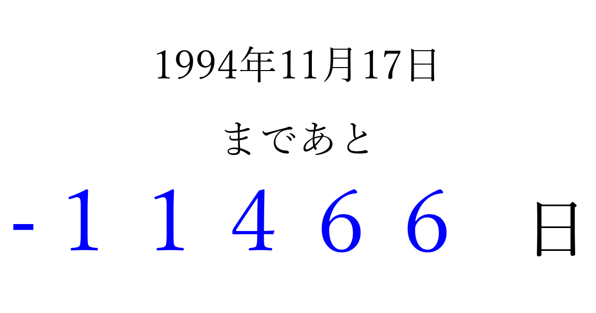 1994年11月17日(木)は もう 00000 日過ぎました 追加すると、トップページからすぐ選べるようになります ※2026/04/09現在の結果です。 最新の状態に更新する ↓シェアして、タイムライン上にカウントダウンを表示しよう!↓ 📤 この結果を共有する Tweet シェア Threads Bluesky 別の日付でカウントダウン 1994年11月のカレンダー このページをブックマークに追加すると、いつでもカウントダウンを確認できます。 (PC: Ctrl+D / Mac: ⌘+D) hitome-notes.comでは以下のページも運営しています。 指定日と期間から日付を計算 | ガチャ確率計算・シミュレーション | プライバシー・ポリシー 運営者:Avocado