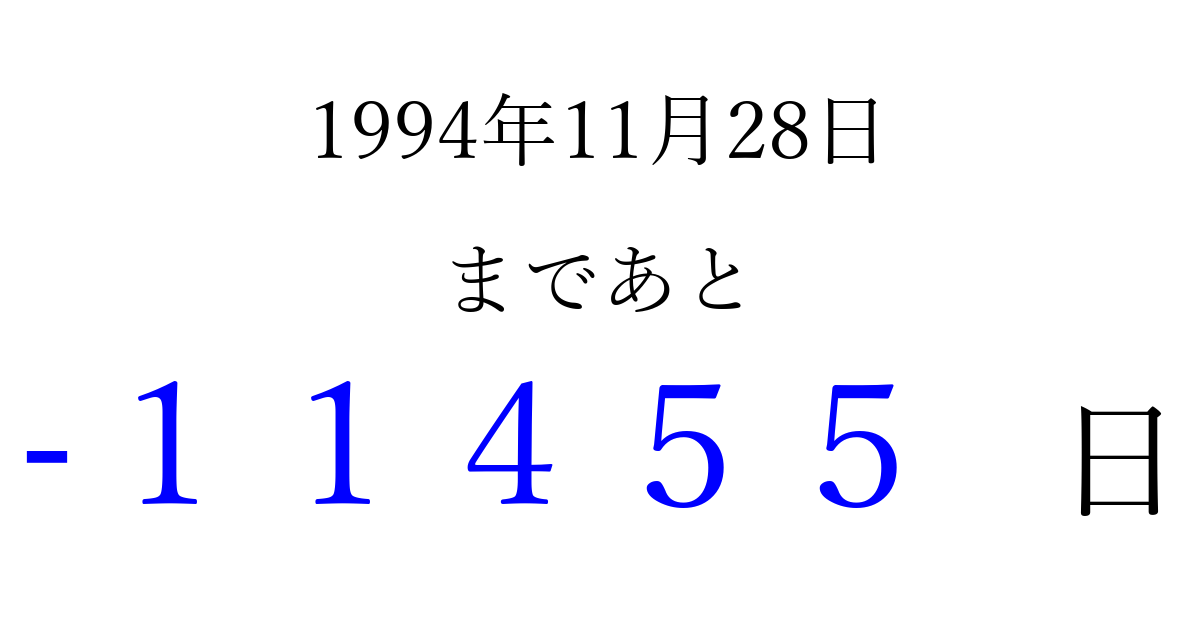 1994年11月28日(月)は もう 00000 日過ぎました 追加すると、トップページからすぐ選べるようになります ※2026/04/09現在の結果です。 最新の状態に更新する ↓シェアして、タイムライン上にカウントダウンを表示しよう!↓ 📤 この結果を共有する Tweet シェア Threads Bluesky 別の日付でカウントダウン 1994年11月のカレンダー このページをブックマークに追加すると、いつでもカウントダウンを確認できます。 (PC: Ctrl+D / Mac: ⌘+D) hitome-notes.comでは以下のページも運営しています。 指定日と期間から日付を計算 | ガチャ確率計算・シミュレーション | プライバシー・ポリシー 運営者:Avocado