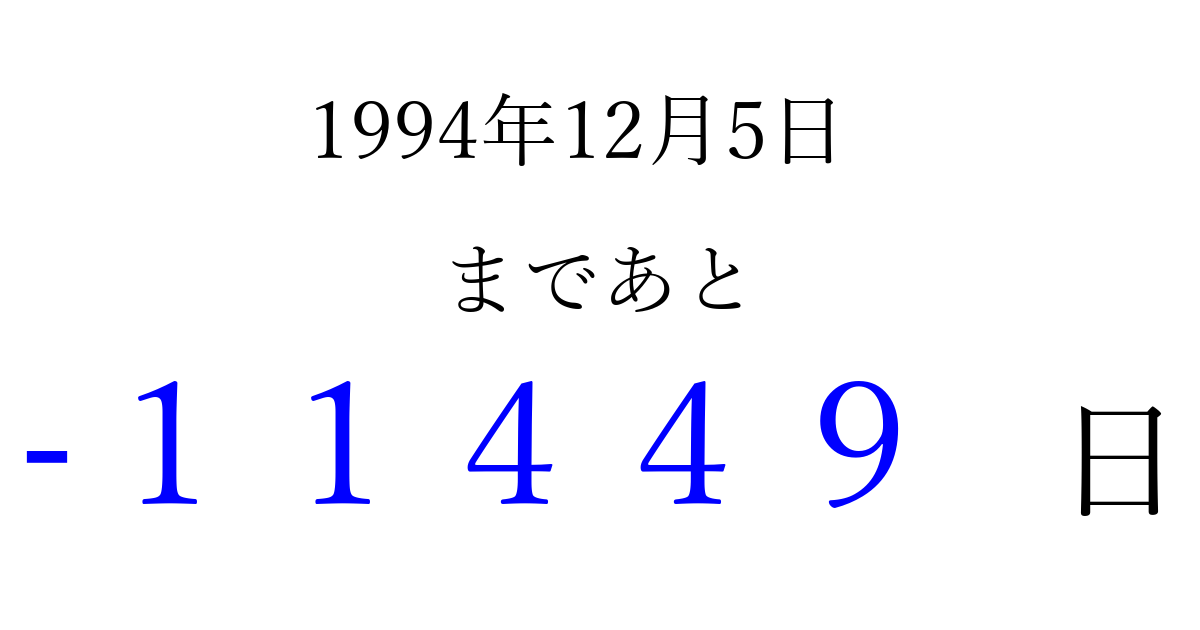 1994年12月5日(月)は もう 00000 日過ぎました 追加すると、トップページからすぐ選べるようになります ※2026/04/10現在の結果です。 最新の状態に更新する ↓シェアして、タイムライン上にカウントダウンを表示しよう!↓ 📤 この結果を共有する Tweet シェア Threads Bluesky 別の日付でカウントダウン 1994年12月のカレンダー このページをブックマークに追加すると、いつでもカウントダウンを確認できます。 (PC: Ctrl+D / Mac: ⌘+D) hitome-notes.comでは以下のページも運営しています。 指定日と期間から日付を計算 | ガチャ確率計算・シミュレーション | プライバシー・ポリシー 運営者:Avocado